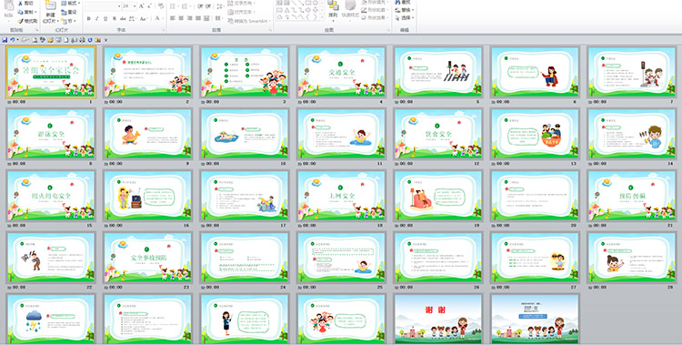 此课件包括:交通安全 游泳安全 饮食安全 用火用电安全 上网安全 预防拐骗 安全事故预防