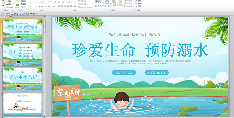 此课件包含:哪些情况容易导致溺水 如何预防溺水 溺水如何自救与施救 预防溺水安全常识