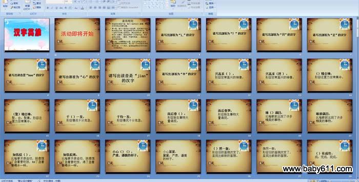 第一轮,每个小组派出一名选手,在规定时间内轮流写出汉字,每位选手有10秒的思考时间,第一名积10分第二名积8分,第三名积5分,第四名积3分.比赛时,每名选手有一次求助机会,向本组观众求助,(要求,不准带字典),并按名次作出相应奖励。
