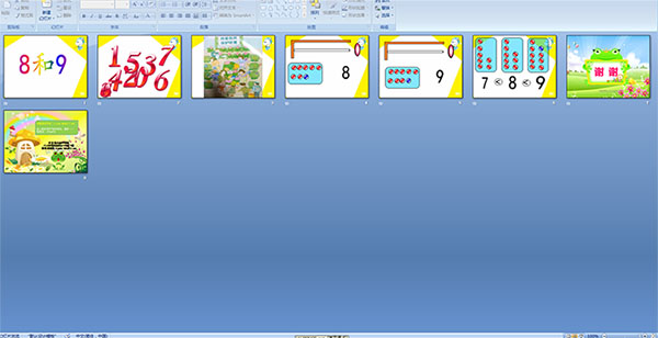 2、让幼儿知道“7”添上“1”是“8”,“8”添上“1”是“9”。